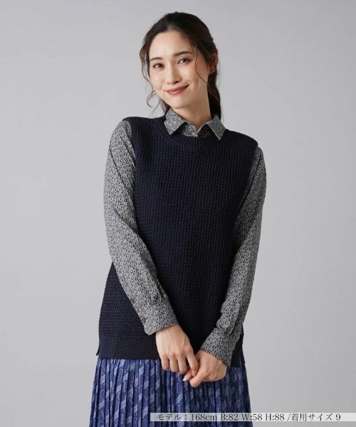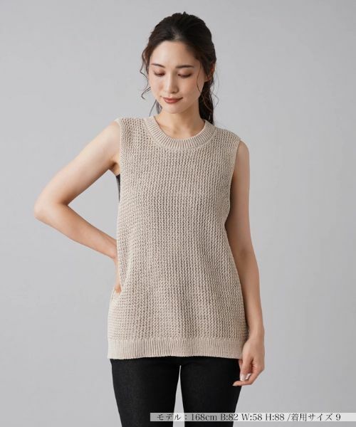 手持ちのシャツやカットソーに重ねるだけで旬なレイヤードスタイルが完成する、スマートなシルエットのニットベスト。二の腕をすっきりと見せてくれるアームホールの形状がポイント。ポリエステルにペーパー素材をブレンドしてざっくりと編んでいるから独特の爽やかな風合いが楽しめます。