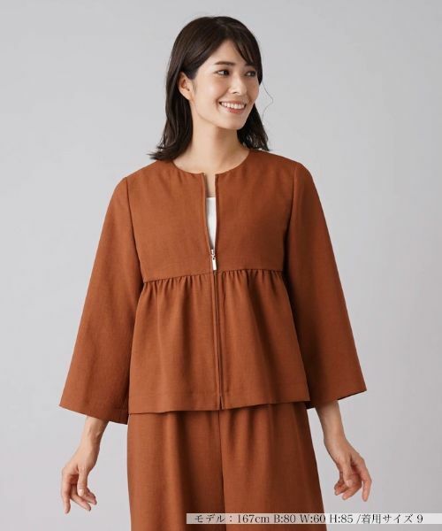 切り替えにたっぷりのギャザーをデザインし、ボトム部分をふわっとしたペプラムシルエットに仕立てたノーカラージャケットです。落ち着いた雰囲気がありつつも、ほんのり甘さを感じさせるアイテムです。フロントはジップアップ仕様でスムーズな着脱が可能。同素材のワイドパンツとセットアップで着こなすのも気分です。
