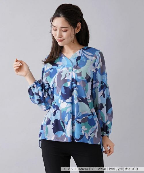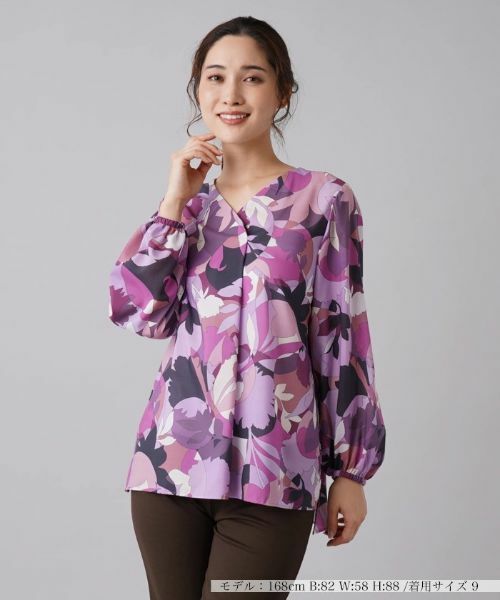 ボタニカルモチーフの幾何学柄がインパクトを放つオーバーブラウス。すっきりとしたシャープなVネックがデコルテを綺麗に覗かせ、さりげなく気品を感じさせます。袖は膨らみをもたせたボリュームスリーブ、ヒップまで隠れる程度の丈感でリラクシングな雰囲気に。■Buyer’s voice巧妙な色使いで表現された斬新な柄がひと味違ったセンスを引き立ててくれるブラウス。ちょっとしたよそ行きシーンなどのスタイリングにもぴったりです。------------------------------------伸縮性:なし透け感:ありポケット:なし生地の厚さ:薄手ウォッシャブル(手洗い可)裏地:なしなし------------------------------------【※定価(税込)は、2023年1月2日のセール開始前の店舗における販売価格です。】 手洗い可酸素系漂白可タンブル乾燥不可つり干し(日陰)アイロン低温120℃までドライクリーニング可ウェットクリーニング(弱い処理)