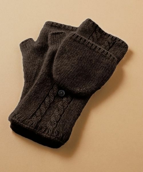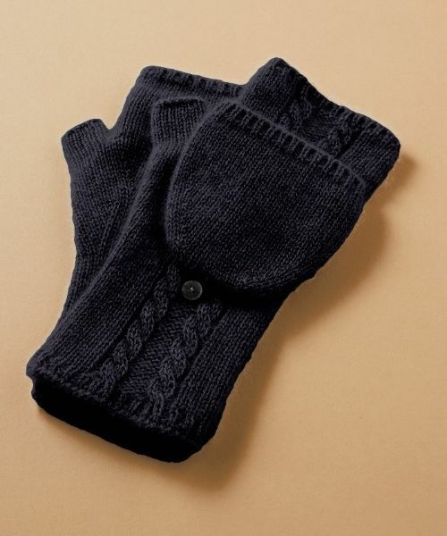 特殊な加工により、ふんわりと柔らかく仕上げた天竺編みとケーブル編みを組み合わせた編み地の手袋。指先部分のカバーを外せば、細かな作業もスムーズに行える仕様です。繊維の風合いが良く、心地よい肌触りが特徴です。