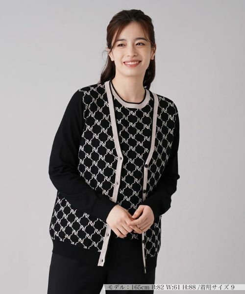 シックで美しい格子状のモノグラム柄が目を惹く、瀟洒なデザインのVネックカーディガン。スリーブや後身頃は無地で切り替え、メリハリ効いた印象に仕上げています。すっきりとしたシルエットで着た際のバランスがよく、プレーンなワイドパンツなどに合わせても品よくまとまります。