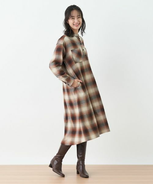 オブスキュアなオンブレチェックが浮かぶ、バンドカラーのシャツワンピース。前立てはハーフプラケット仕様とし、すとんと落ちるようなリラックスシルエットでデザインしています。両胸にレイアウトしたスクエアポケットが存在感を放ち、絶妙なアクセントに。上と左右にはスリットポケットを配しています。足元にはブーツやブーティを合わせると、より秋らしい雰囲気に仕上がります。