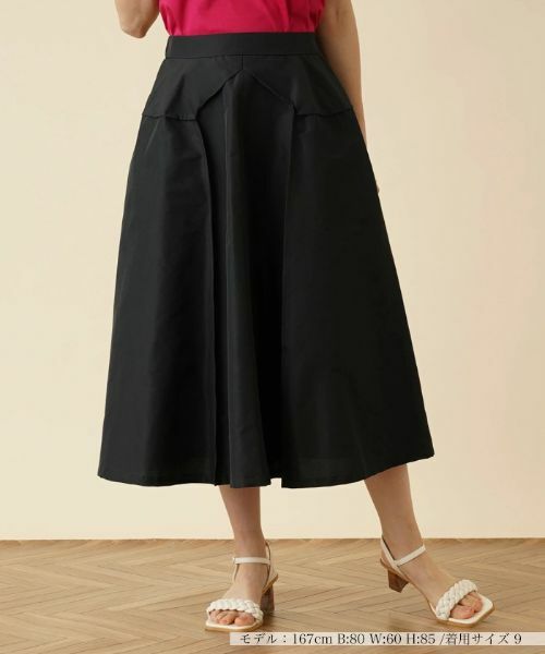 端正なAラインシルエットを描き出すミディスカート。ウエスト周りの切り替えや立体感のあるプリーツが特徴的。さらりとした風合いのポリエステル素材を使い、初夏らしい爽やかな穿き心地を叶えました。バックウエストはゴム仕様とし、心地よいフィット感をもたせています。ベーシックなデザインでトップスともコーディネートしやすい一枚です。バックファスナーあり。