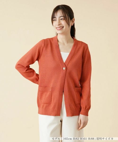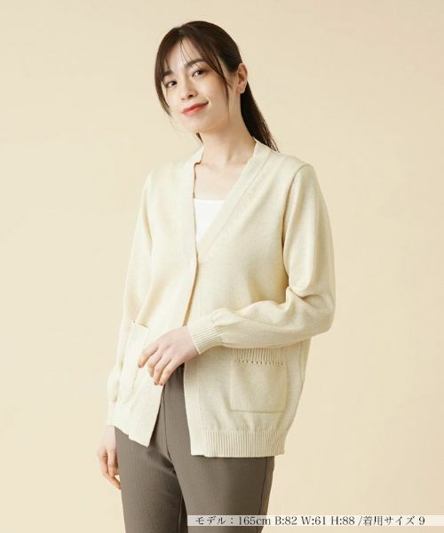 ほんのりシアーな風合いが涼しげな表情を見せてくれる、Vネックニットカーディガン。ペーパー素材をブレンドして編み込んだニットの独特な風合いが感じられる一枚です。フロントポケットやバックには透かし編みでラインを描き、さりげないアクセントをプラス。シンプルなカットソーと合わせるだけでも、春夏らしい品のあるカジュアルスタイルが完成します。