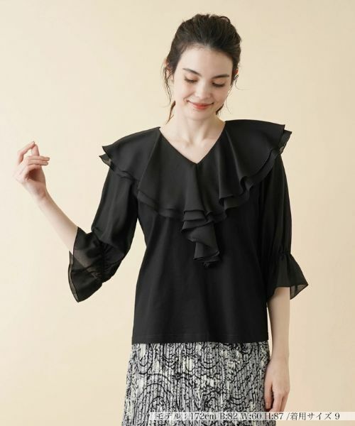 二重仕立てのティアードラッフルフリルが華やかな表情を見せてくれるカットソー。フレアに仕上げたキャンディスリーブも、さりげなく大人の可愛らしさを感じさせるエッセンスに。袖口はゴムシャーリングで心地よいフィット感をもたせました。フェミニンなスカートはもちろん、プレーンなパンツに合わせるだけでもひと味違ったリュクス感溢れるコーディネートが完成します。