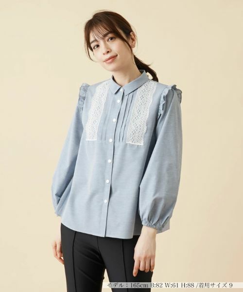 ポリエステル×コットンの爽やかな風合いの生地で仕立てたブラウス。シンメトリーに施したピンタックとレース、さらにショルダーラインにフリルをあしらい、イノセントな愛らしさを表現しています。ゆるっと着られるフレア感のあるシルエットで軽やかなニュアンスに。袖口はゴム仕様とし心地よいフィット感をもたせました。大人スタイルをちょっぴり甘く仕上げてくれる一枚です。