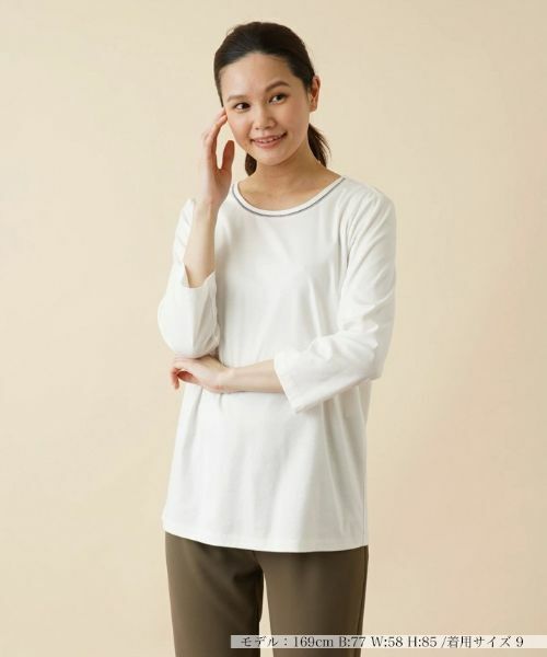 滑らかな表面感のコットン生地を使用した七分袖カットソー。ネックラインのボールチェーンを使ったアレンジが顔周りのワンポイントになってくれるから、アクセサリーなしでもさりげなく華やかに仕上がります。すっきりとしたシルエットで着こなしやすく、シーンを選ばずに活躍してくれるアイテムです。バックネックの涙あきはボタン開閉可能。