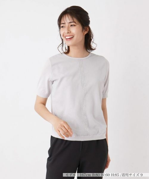 前身頃のみチュール素材を重ね付けした、涼やかなニュアンスのカットソー。フロント中央には三本のラメラインを施し、リュクス感を漂わせるアクセントに。袖口や裾はリブ仕様で心地よいフィット感をもたせました。ベーシックな丈感なのでボトムスを選ばずに合わせやすく、多彩なコーディネートに取り入れやすい一枚となっています。------------------------------------着用シーズン:初夏伸縮性:あり透け感:ありポケット:なし生地の厚さ:薄手裏地:なし-------------------------------------※商品の色味は、撮影場所や光のあたり具合、お客様のお使いの機器により色味が違って見える場合がございます。予めご了承ください。※定価(税込)は、2023年06月29日のセール開始前の店舗における販売価格です。家庭洗濯不可漂白不可タンブル乾燥不可アイロン低温120℃まで石油系溶剤ドライクリーニング弱ウェットクリーニング不可