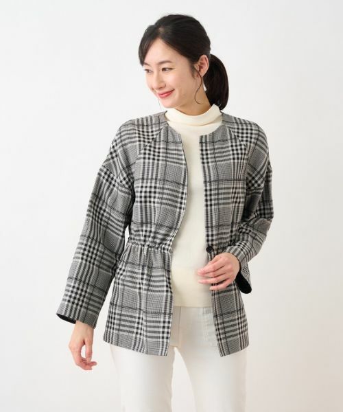 表側は先染めのグレンチェック柄、裏側は上質感のある黒無地でデザインした、一重仕立てのノーカラージャケットです。袖はドロップショルダー×ラグランスリーブで丸みのある優しいシルエットに。裾のサイドスリットがアクセントになり、絶妙な抜け感を作り出しています。ウエストはドローコードにより絞りが入れられます。袖口を折り返して着用も可能。