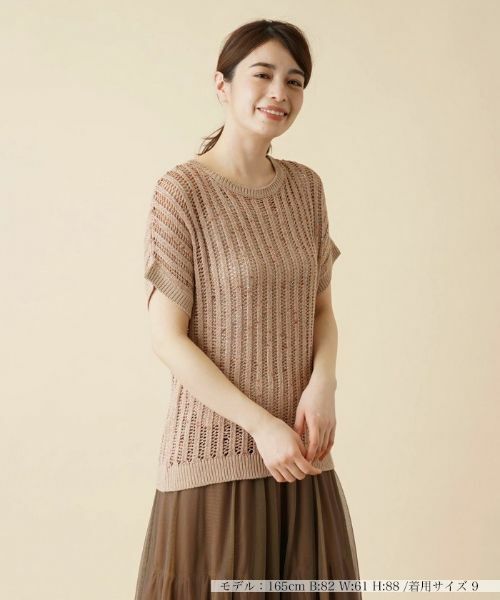 これからの季節らしい涼やかさを感じさせる、透かし編みのニットプルオーバー。クルーネックラインはすっきりと開き、袖はフレンチスリーブでニットの風合いに合わせて絶妙な抜け感を作り出しています。心地よくフィットするスマートなシルエットで着こなしやすい一枚。パンツにもスカートにもコーディネートしやすく、着回し力の高いトップスです。