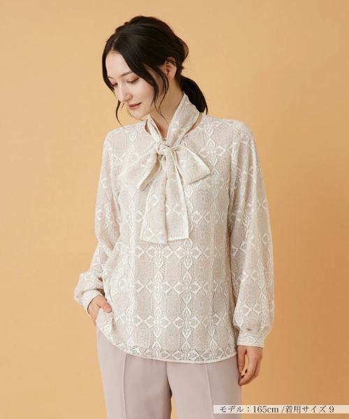 一点投入でこれからの季節のコーディネートに華やぎを与えてくれる、繊細なレース仕立てのボウタイブラウス。ボウタイは取り外し可能なので、シンプルなオーバーブラウスとしても着用できます。定番のパンツスタイルはもちろん、スカートを合わせたフェミニンルックにもオススメ。バック中央のボタンにより着脱が可能です。