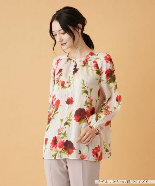 うっすらとナローストライプが浮かぶ生地に、絵筆タッチのフラワー柄をプリントしたヘンリーネックブラウス。濃淡が際立つ優しい色使いでフラワー柄が表現されています。袖はラグランスリーブで仕上げ、シルエットにゆとりをもたせることで肩肘張らないリラクシーな着心地を叶えました。フロント中央にはリズミカルにボタンをあしらい、存在感のあるアクセントに。大人の日常着としても重宝するアイテムです。