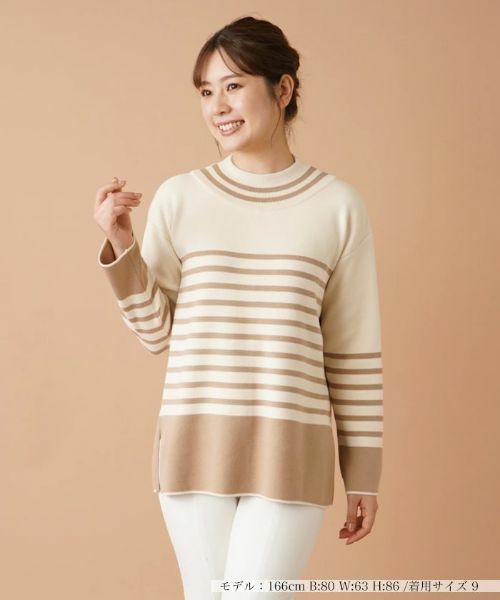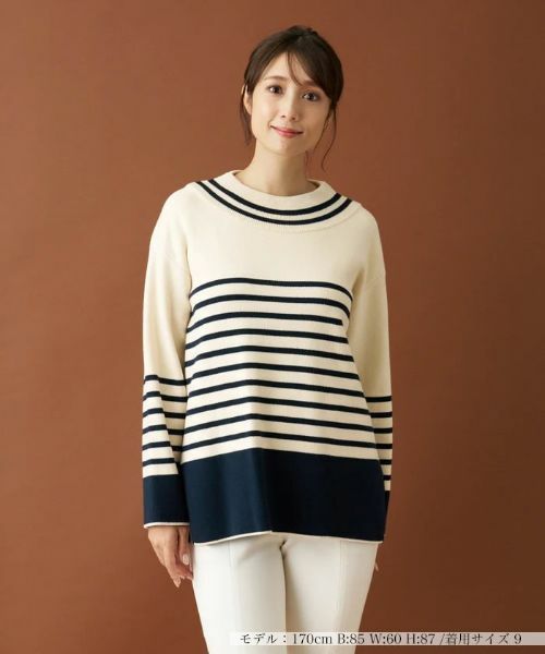 暖かみのあるウィンターコットンにアクリルをブレンドして編み込んだ、マリンテイストのボーダーニットプルオーバー。程よい抜け感のあるモックネックがデコルテ周りをさりげなくカバー。身体のラインが目立たないゆったりめのシルエットでリラックス感溢れる着心地を叶えました。シンプルなパンツはもちろん、スカートとの相性もよく、コーディネート力抜群のアイテムです。