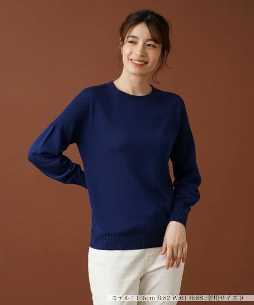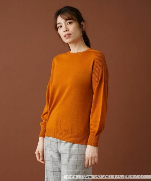 カジュアルにもキレイめにも合わせやすい、シンプルなデザインのクルーネックのニットプルオーバー。ネックラインを浅めに設定することで上品かつ落ち着いた雰囲気に仕上げました。ショルダーから袖にかけてのリブ編み切り替えがちょっぴりユニークなアクセントに。多彩なボトムスにマッチするすっきりとしたシルエットで着回し力も抜群です。