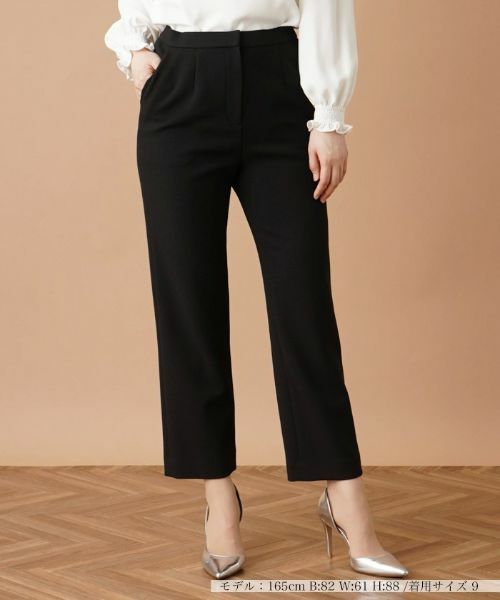 微光沢感のある滑らかな風合いの生地を使用した、ベーシックな無地のストレートパンツ。生地にはストレッチ性があり、適度なリラックスシルエットで穿き心地も快適。コーディネートを選ばずに合わせやすく、フレキシブルに活躍してくれるアイテムです。タックインすればスタイルアップ効果も期待できそうです。ホック&スナップ、ファスナーにより開閉が可能。