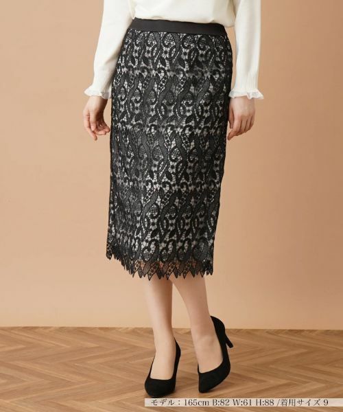 クラシカルな趣を感じさせる、繊細なレース素材で仕立てたタイトスカート。ヒップやレッグラインをすっきりと引き立てるスマートなシルエットでデザインしています。後ろ裾の中央にはスリットを入れ、スムーズな足捌きにも配慮しました。シンプルなニットやブラウスとコーディネートするだけで、リュクス感溢れる大人フェミニンなスタイルが楽しめます。バックファスナーにより開閉が可能。