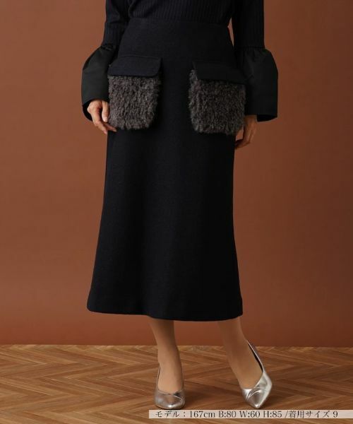 前ウエスト両サイドに取り外し可能なボアポケットを配したミモレスカート。落ち着いたシックなカラーのメルトン調生地で優しい温もりが感じられ、これからの季節のコーディネートに取り入れやすい一枚です。広がりを抑えたAラインシルエットで大人っぽさをキープしているから、きれいめの着こなしにもマッチ。バックファスナー&鍵ホックにより着脱が可能です。同素材のベストを合わせたコーディネートもおすすめです。