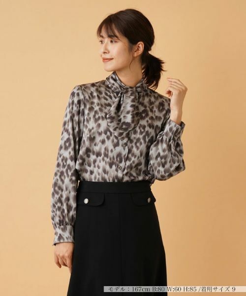 秋冬シーズンらしい色合いで表現したレオパード柄がコーディネートを引き立てるボウタイブラウス。ネック周りに結んだ短めのボウタイがほんのり華やかなエッセンスに。袖には適度なボリュームを持たせ、軽やかなニュアンスを生み出しています。一枚での着こなしはもちろん、コートやジャケットのインにもオススメです。ボウタイは取り外し不可。