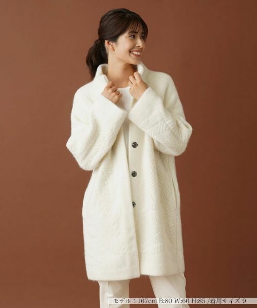 レリーフを思わせる繊細なボタニカル調の編み柄が浮かぶ、スタンドカラーのニットジャケット。ドロップショルダーで肩ラインを落としつつ、ヒップまですっぽりと包み込んでくれる、ロング丈のコクーンシルエットでデザインしています。フロントはスナップボタン仕様でスムーズに開閉が可能。前ウエスト左右にはスリットポケットをバランスよくレイアウトしています。温かみのある色合いでカジュアルにもオフィシャルにも使いやすいアウターです。