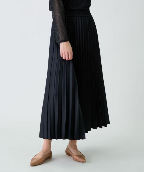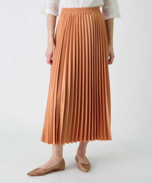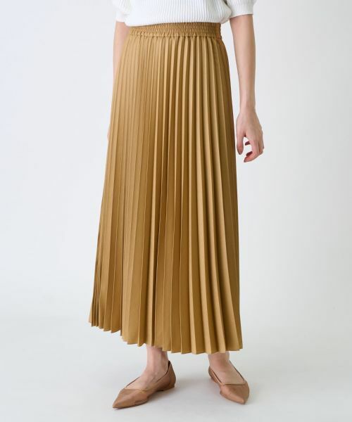 アコーディオンプリーツがエレガントな大人のスタイルを引き立てるマキシスカート。柔らかな光沢が纏った素材が洗練された印象を深めます。プリーツの繊細さも相俟って縦ラインを強調し、美しいAラインシルエットを描き出します。動くたびにふわりと波打つヘムがナチュラルな躍動感を演出。ウエスト部分はゴム仕様で柔軟性に富み、快適な穿き心地を提供します。使い勝手がよくデイリーコーデにもさりげなくマッチする一枚です。