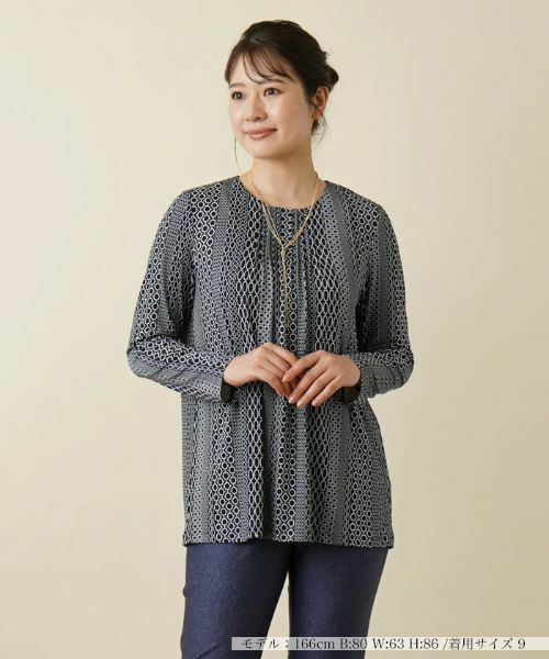 繊細なチェーン柄がプリントされたプルオーバー。クラシックなチェーンモチーフを現代的な感覚で表現した一枚は、落ち着いた色調で洗練された雰囲気を醸し出します。過度に主張することなく、様々なアイテムと調和するバランスのよさがポイント。生地には適度なストレッチが効いているので動きやすく着心地も快適です。バックネックの涙あきはループボタンにより開閉が可能。カジュアルからエレガントまで、多彩なコーディネートで活躍してくれそうなアイテムです。