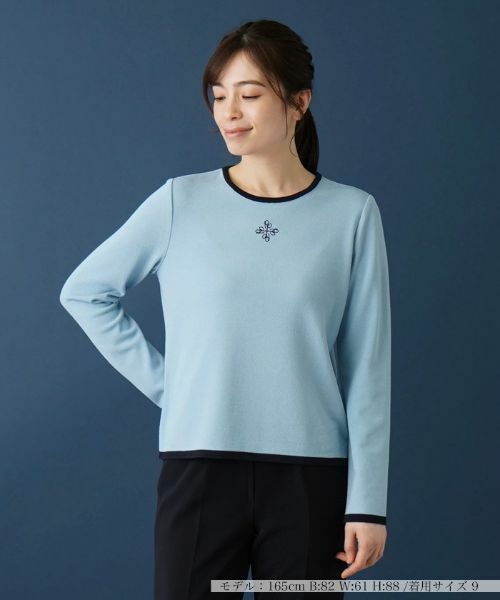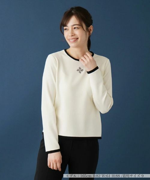 アウトラインのトリミングによりコントラストを効かせた、バイカラーデザインのクルーネックニット。フロント中央にさりげなくマークしたモチーフがワンポイントになっています。上品なカラーリングで取り入れやすく、軽やかな着心地が感じられるので、これからの季節のデイリースタイルにぴったりです。