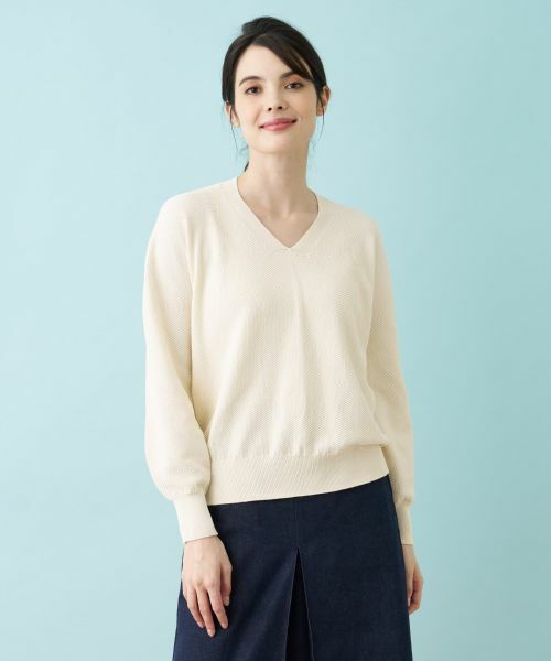 ホールガーメントのプルオーバーニット。Vネックですっきりとした印象です。表面の凹凸感と後ろ身頃に分量が出る立体的なデザインが魅力的です。吸水、速乾性に優れたコットンポリエステルのドライタッチで肌触りのいい素材を使用しています。