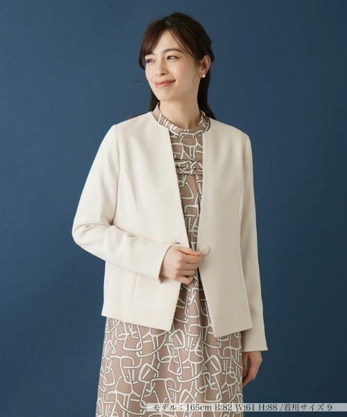 肌当たりのよいスムースな風合いの生地で仕立てた、1つボタン留めのノーカラージャケット。深めに開いたシャープなVネックにすっきりとした細身のシルエットも相俟って、大人の女性らしい洗練された佇まいを演出します。スリット入りの袖口は折り返してのアレンジも可能。セットアップでの着用はもちろん、ワンピースやロングスカートといったフェミニンなアイテムの引き締め役としても重宝しそうです。