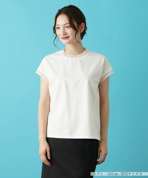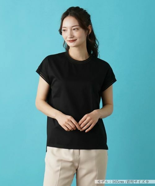 ネックラインと袖口のシアーな異素材切り替えが、シーズンらしい涼やかさを醸し出すフレンチスリーブカットソー。程よいゆとりをキープしつつもどんなボトムスとも合わせやすい絶妙なシルエットで、着回しにも最適な一品。