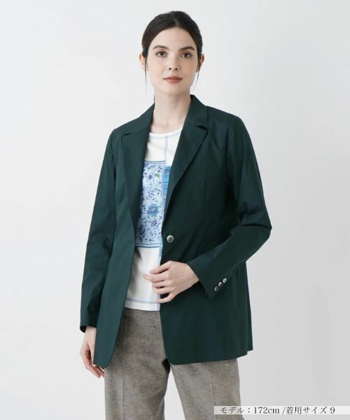 マニッシュな雰囲気でスタイリングできる、ややゆったりとしたシルエットのテーラードジャケット。コットンにナイロンをブレンドした爽やかな風合いの生地を使用しており、生地には優れたストレッチ性があるので身体の動きに柔軟に対応します。前立てや袖口に輝く貝調ボタンがエレガントなアクセントに。フロントボタンを開けてラフに羽織れば、美しいラインがさらに際立ちます。無駄な装飾を省いたベーシックな無地でボトムスともコーディネートしやすく、着回し力に優れた一着です。