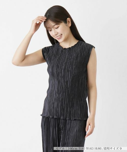 細やかなランダムプリーツが独特の表情を作り出すノースリーブカットソー。すっきりとしたミニマルなシルエットでもたつきがなく、ジャケットのインナーとしても最適。日常のスタイリングにさりげなくエレガントな雰囲気を加え、コーディネートを格上げしてくれそうです。別売りのパンツを合わせてセットアップとしても楽しめるため、様々なシーンで活躍してくれそうです。シンプルながらもこだわりを感じられるデザインが魅力のアイテムです。