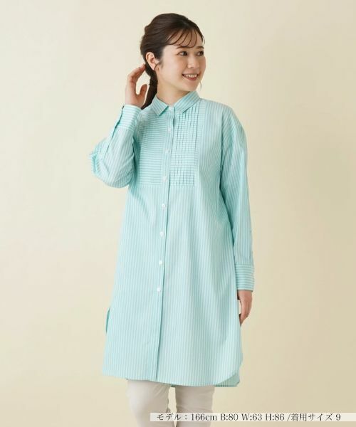 胸元に施されたプリーツタックが上品な魅力を引き立てる、爽やかなストライプ柄のシャツワンピース。ラウンドカットヘムの軽やかなシルエットで、春夏シーズンの装いに優しげなムードを添えてくれる一枚。肌触りのよいやや薄手のコットン生地を使用しているので着心地も快適。細身のパンツを合わせるだけで、大人のエレガンスが薫るスタイリッシュなカジュアルルックが完成します。