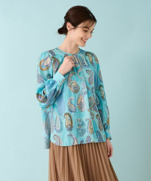 小花や様々なペイズリーが表現されたプルオーバーブラウス。イタリア製の上品なポリエステルサテンを使用しています。奥行きのある構図で、色の発色性と組み合わせがインポートらしいエレガントなブラウスです。スカートにもパンツにも合わせやすいデザインです。