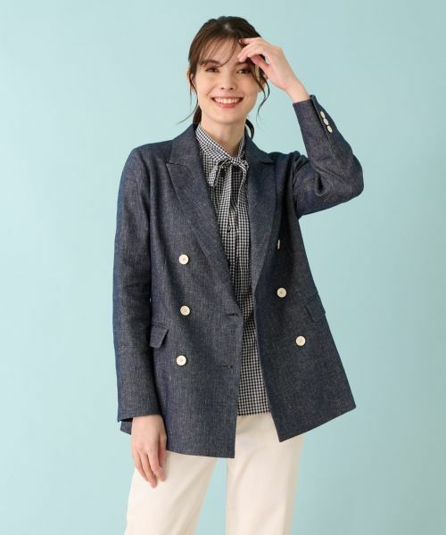 イタリア製の麻混デニム調素材を使用したダブルブレストジャケット。ナチュラルなネップと、ストレッチ性が特長の素材です。白い釦が爽やかな印象に。裏地は無しの仕様で軽く仕上げています。袖を通さなくても肩に羽織るだけでサマになる、お洒落感漂うデザインです。