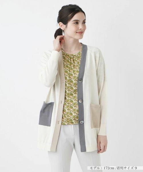 アシンメトリーなカラーブロックデザインがさりげなく個性を主張する、モダンなムード漂うVネックニットカーディガン。ハイゲージで編み込んだやや薄手のニットの優しい温もりを感じられる一枚です。リラックス感のあるラグランスリーブで、すっきりとしたシルエットでありながらストレスフリーの着心地を実現しています。大きめの貝調ボタンが艷やかな光沢を放ち、絶妙なバランスのアクセントをプラス。ヒップまで隠れるやや長めのレングスでさりげなく体型カバーも叶います。