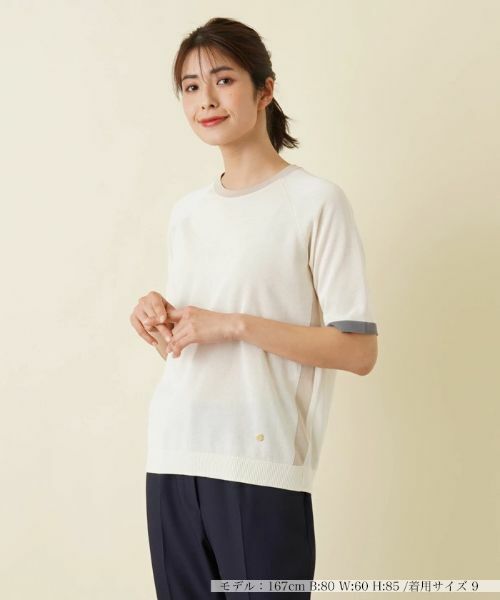 軽く柔らかな素材で丁寧に編まれた、ほんのり透け感のある半袖ニットプルオーバー。ネック周りと袖口は配色で巧みに切り替え、さりげなくセンスを感じさせるアクセントに。袖はラグランスリーブで動きやすさを重視し、ストレスフリーの快適な着心地でリラックス感溢れるカジュアルルックを後押しします。これからの季節の陽射しに映える、大人の女性らしい爽やかな着こなしにアップデートしてくれる一枚です。