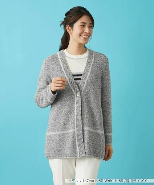 麻のようなシャリ感と、清涼感のある和紙混素材のカーディガン。表情感のあるメランジのガーター編みが特長です。配色ラインを効かせてアクセントにしています。