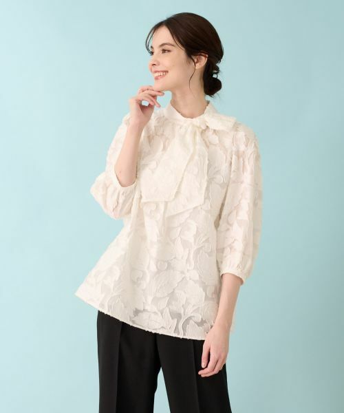 コーディネートの主役になれる華やかなプルオーバーブラウス。リーフ柄のカットジャカードは、コットン混で清涼感のある素材。襟元のタイはスラッシュ開きで取り外し可能になっていますので、シンプルなブラウスとしても着用できる2Wayタイプ。昼間はオフィスでシンプルに、夜は会食やパーティでリボンを使って華やかに・・・シーンに合わせた着こなしが楽しめる嬉しいデザインです。