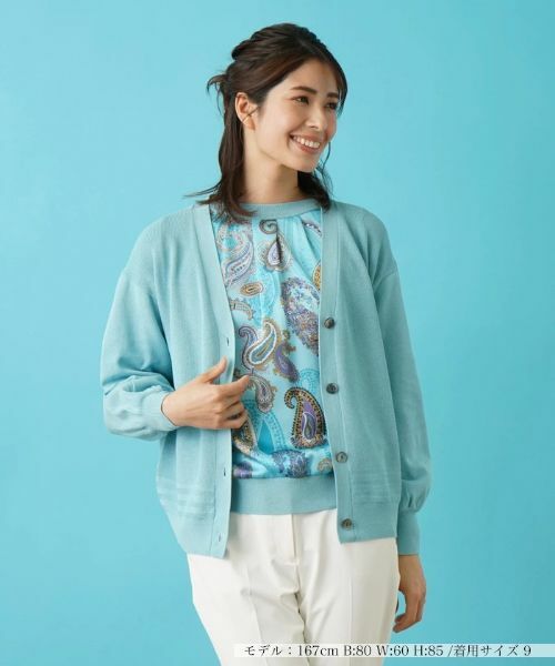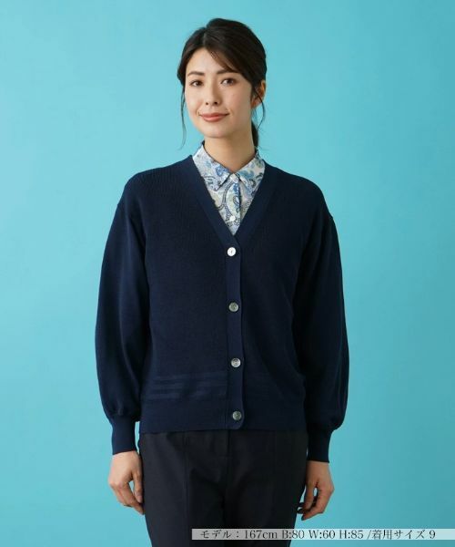 コットンブレンドの軽やかな着心地がこれからの春夏シーズンに嬉しい、Vネックニットカーディガン。ドロップショルダーが生み出すリラックスシルエットで気負わずにスタイリングでき、カジュアルからオフィスまで幅広いシーンで活躍してくれそうな一枚です。ヘムにあしらわれたボーダー状の柄編みが表情にニュアンスを加え、着こなしに深みをもたらします。