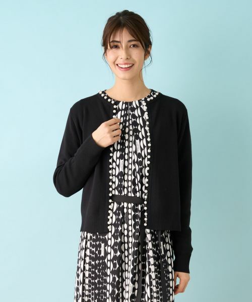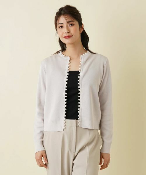 パールのトリミングがエレガントなニットカーディガン。編み地はハイゲージのスムース編みで程よい厚みと美しい目面が特長です。光沢感のある肌触りの良いコットンポリエステルの糸を使用してます。ジャケットを感覚で着られる上品なアイテムです。