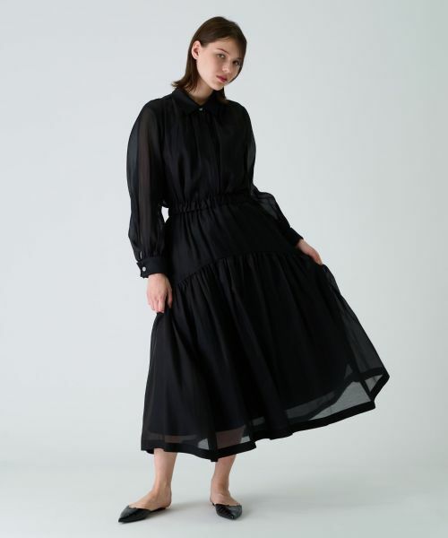 コットンにシルクをブレンドした、シアー素材をメインに使用したロングスカート。裾に向かってふわりと広がりをもたせたシルエットが大人エレガントな雰囲気。ギャザーによるドレープ感が柔らかな表情を作り、絶妙なバランスでデザインされています。総ゴムのウエストは付属の共布リボンベルトを結ぶことでほんのり甘く華やかなエッセンスに。落ち着いたシックなカラーで合わせやすく、セットアップでのコーディネートにもおすすめです。