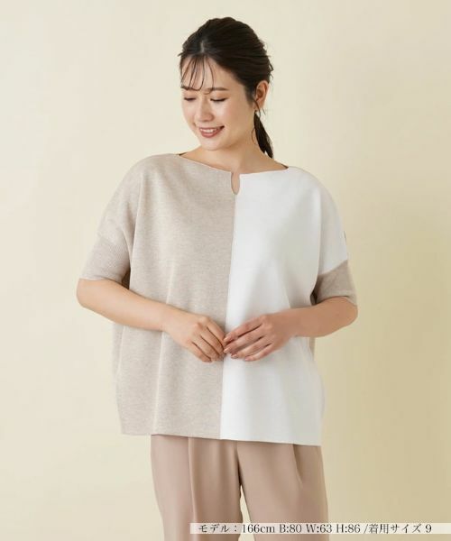 コーディネートに差をつけられるカラーブロッキングデザインのニットプルオーバー。浅めに開いたキーネックがデコルテ周りをキレイに引き立てます。ドロップショルダーで程よい落ち感をもたせ、身頃はゆったりめのシルエットでリラクシーな雰囲気に。シンプルな定番のパンツルックはもちろん、フェミニンなスカートを合わせてもバランスよくまとまります。