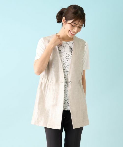 ナチュラルな麻素材にシルバーの箔プリントを施しシャイニー感を出したジレ。高めのウエスト位置に平ゴムをいれてギャザーをよせることでスタイルアップ効果も。