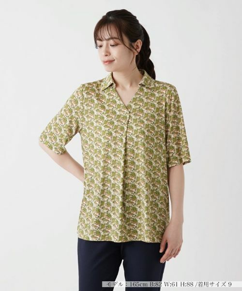 エキゾチックなボタニカル柄のプリントが個性を引き立てるスキッパーブラウス。シャープに開いたネックラインがデコルテを覗かせ、絶妙なバランスの抜け感を作り出します。とろみのあるやや薄手のストレッチ素材が体に優しく寄り添ってくれるから着心地も良好。ヒップまでさりげなく隠れる程度の丈感でナチュラルに体型カバーできるのも嬉しいポイントです。定番のパンツはもちろん、フェミニンなスカートを合わせた華やかな着こなしもサマになります。