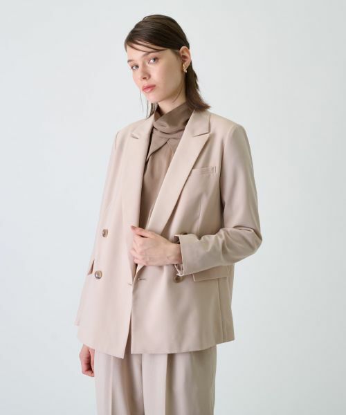 春らしい上品なカラーリングでデザインされた、ピークドラペルのダブルブレストジャケット。緩やかにラウンドしたラペルのラインや、程よくウエストシェイプしたシルエットが洗練されたスマートな着こなしを演出。前立てや袖口には表情のあるマーブルボタンを採用しており、さりげなくこだわりを感じさせるエッセンスに。後ろ裾はセンターベント仕様とし、動きやすさにも配慮されています。同素材のボトムスを合わせてセットアップでの着用もおすすめです。