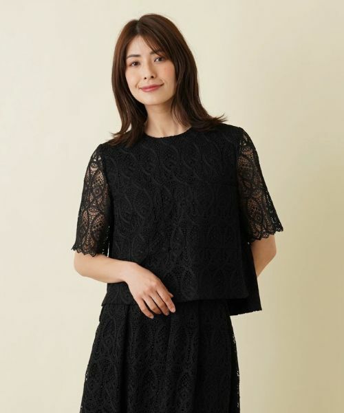 繊細なレースの美しい風合いに心惹かれる半袖ブラウス。シアーに切替えたスリーブが上品さのあるワンポイント。前後差のあるヘムに仕上げたやや短めの着丈だから、ワイドパンツに合わせてもすっきりと仕上がります。------------------------------------着用シーズン:初夏伸縮性:なし透け感:なしポケット:あり生地の厚さ:やや薄手裏地:なし-------------------------------------※商品の色味は、撮影場所や光のあたり具合、お客様のお使いの機器により色味が違って見える場合がございます。予めご了承ください。※定価(税込)は、2024年6月28日のセール開始前の店舗における販売価格です。家庭洗濯不可漂白不可タンブル乾燥不可アイロン低温120℃まで石油系溶剤ドライクリーニング弱ウェットクリーニング不可