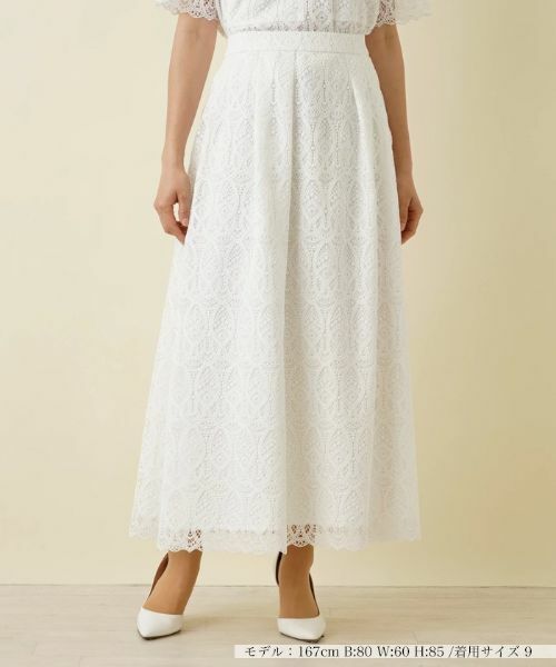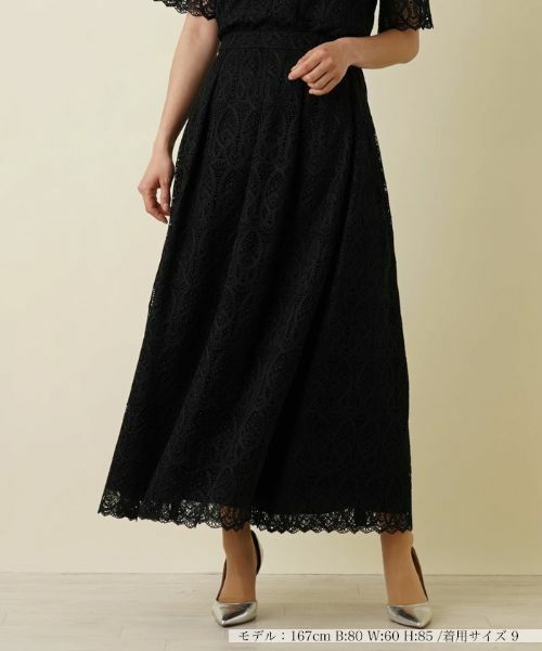 モチーフレースの美しい風合いに心惹かれるロングフレアスカート。程よくボリュームを持たせたシルエットも目を引く、華やかさを感じさせてくれる1枚。プレーンなブラウスやカットソーと合わせるだけでもフェミニンなムードに仕上がります。