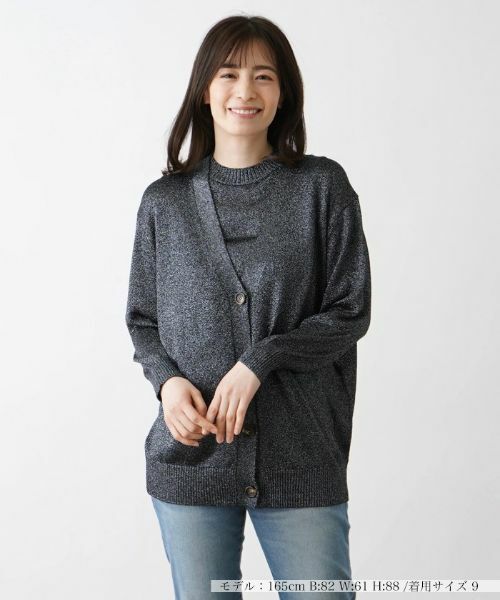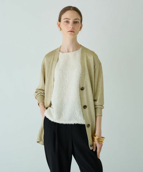 メタリックな輝きが大人ゴージャスな魅力を引き立てる、Vネックのラメ入りニットカーディガン。ゆったりとしたサイジングだから気になるボディラインをカバーしながら、ちょっぴりこなれた雰囲気薫るレイヤードに仕上がります。