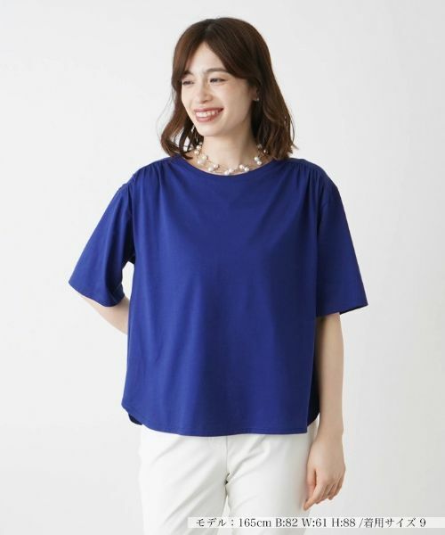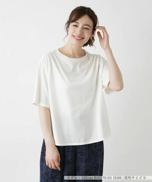 ふんわりと柔らかく、ナチュラルな肌触りが心地よいコットン素材で仕立てた五分袖カットソー。ゆったりとしたリラックス感のあるシルエットは、肌への接触面が少なく、爽やかな着心地を実現します。ショルダー部分にはさりげなくギャザーをあしらい、柔らかな女性らしさを引き立てるアクセントに。無駄な装飾を省いたベーシックな無地で着こなしやすく、一枚でのスタイリングはもちろん、インナーとしても重宝しそうなトップスです。