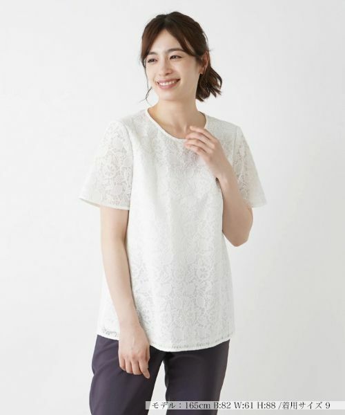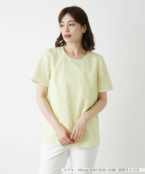 フルーツとリーフのモチーフレース切り替えが目を惹く、華やかな表情を演出する半袖プルオーバー。前身頃には美しいレースを、後身頃にはソフトなカットソー生地を使用しており、着心地の良さも兼ね備えた一枚です。身幅にゆとりを持たせたリラックスシルエットなので、ボトムアウトでさらりと着こなすスタイルもおすすめ。デニムやスカートと合わせて、カジュアルからフェミニンまで多彩なコーディネートで活躍します。バックネックの涙あきはボタン開閉が可能。